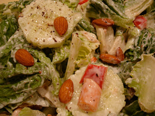 Dinner was my Vegan take on “Cesar” Salad. Romaine, cukes, tomatoes, raw almonds and dressed with my Vegan Homemade “Cesar” Dressing . Really easy, really good. Try it!